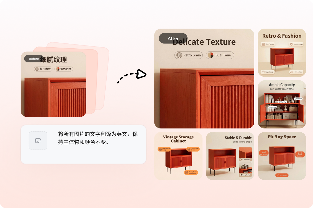 批量翻译电商主图图文,精准转换多语言,完美保留原有排版,助您一键铺货全球。