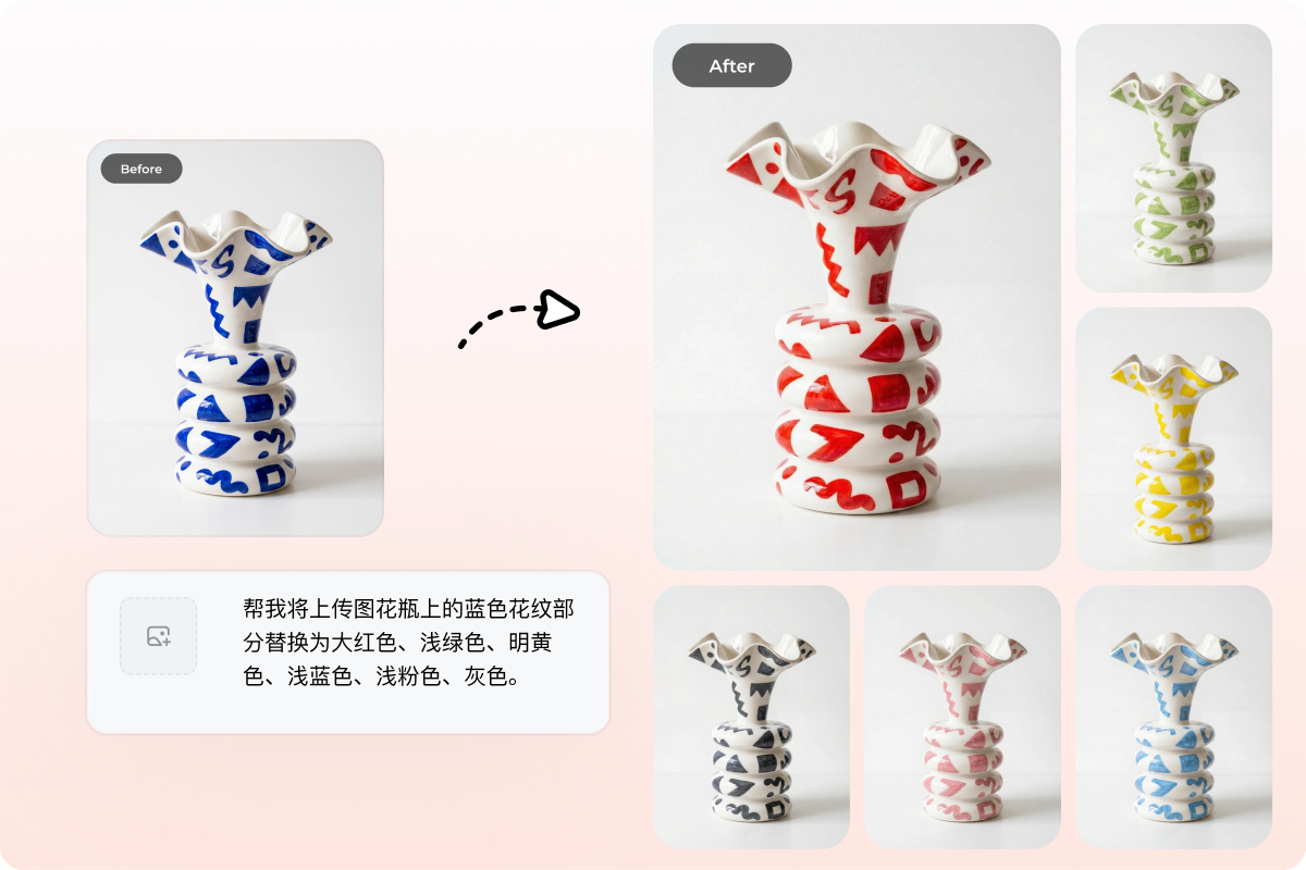 一键生成商品多色图,多款同出,无需重拍,无需手动修图。轻松打造多色商品矩阵,提升上新效率,获得更多曝光机会。