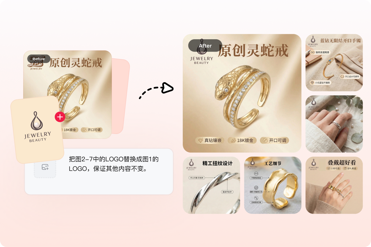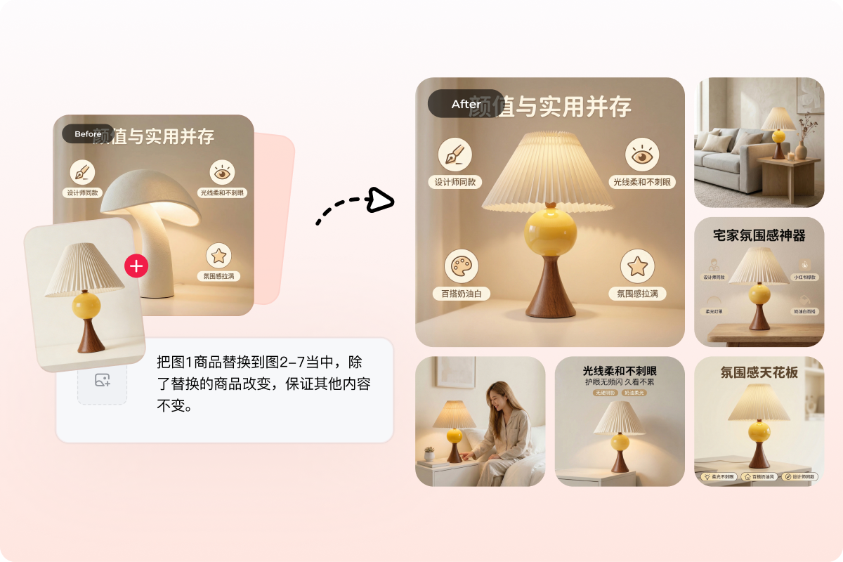 让每个爆款主图都能快速复用,只需一键替换主体,原有构图、风格、卖点文案全部保留。批量操作,省时省力,轻松实现多品上架、快速测款。