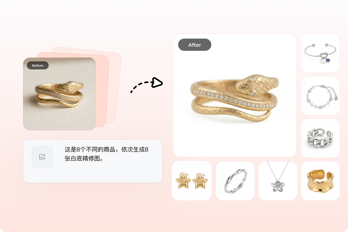 告别繁琐的抠图、调光、去瑕疵,一键即可批量完成白底图处理。对每一件商品进行精细化质感还原,让每一张图都达到影棚级标准。零门槛实现专业级修图效果,小白也能轻松上手。