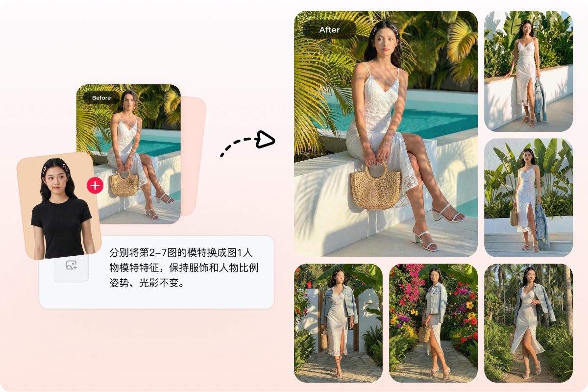 批量模特换脸,精准保持五官、肤色、身材比例一致。智能融合,自然统一,让同一模特形象快速覆盖所有商品图。告别重复拍摄,轻松打造品牌专属视觉资产。
